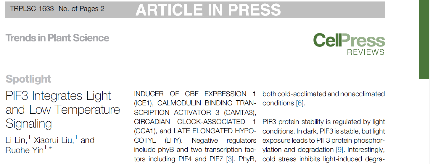 近日,happy漫画 植物光控发育团队在Cell Press旗下的专业综述杂志Trends in Plant Science在线发表了一篇题为“PIF3 Integrates Light and Low Temperature Signaling”的热点推荐文章(Spotlight)。