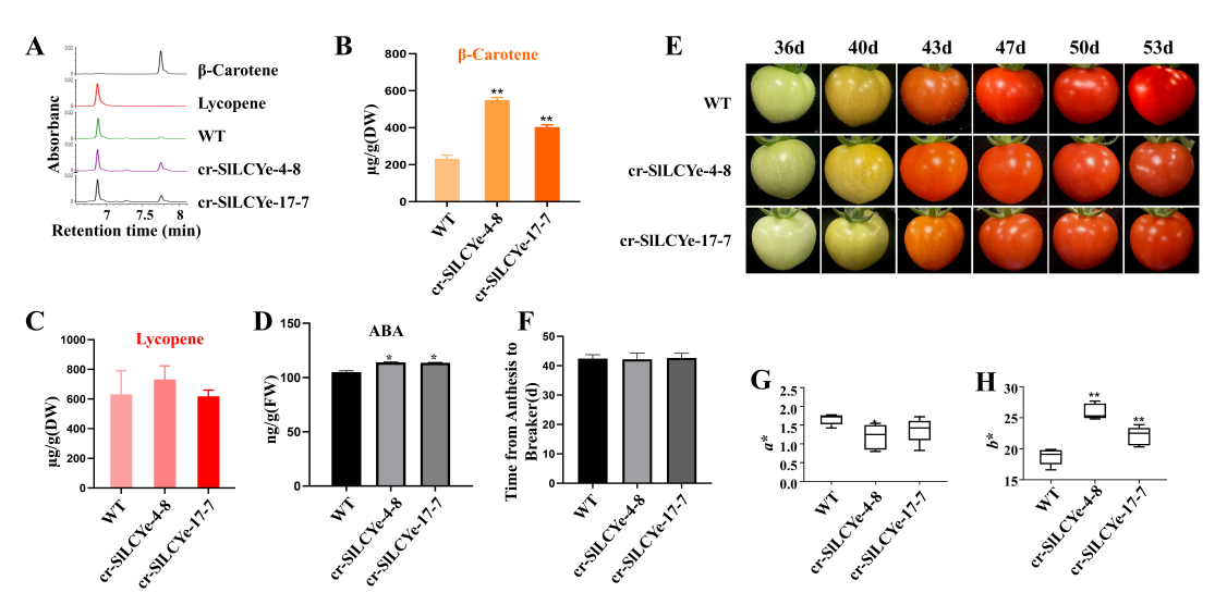 研究结果显示,经LC-MS检测,两个突变体番茄的β-胡萝卜素含量均显著提升:cr-SlLCYe突变体含量为野生型的1.7-2.4倍,cr-SlBCH突变体为野生型的2.3-2.5倍,且番茄红素含量未受影响,避免了传统育种中“顾此失彼”的问题。