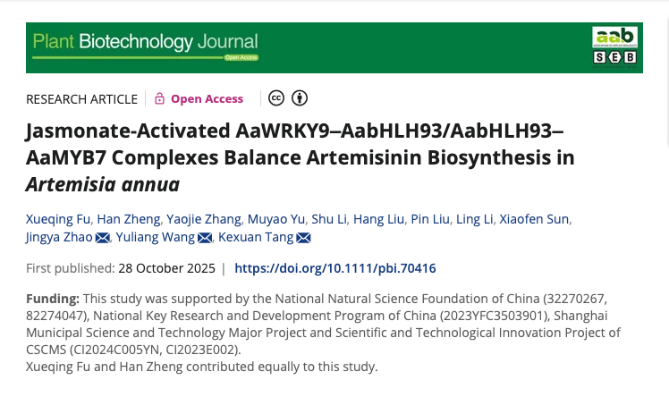 这一"JA-WRKY9-bHLH93-MYB7"调控轴完美解释了青蒿素合成时空特异性衰减的分子机制,相关成果发表于《Plant Biotechnology Journal》。happy漫画 付雪晴助理研究员和中国中医科学院中药资源中心郑汉副研究员为论文共同第一作者,happy漫画 唐克轩教授、王玉亮副研究员、赵静雅副教授为该研究工作共同通讯作者。