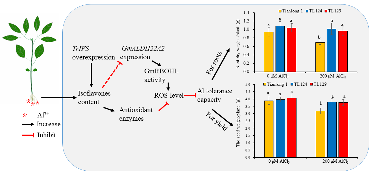 本研究不仅获得转TrIFS大豆新种质,揭示了大豆异黄酮调控活性氧积累的新机制,同时也为培育兼具耐铝和高异黄酮含量的大豆新种质提供了一种新途径。