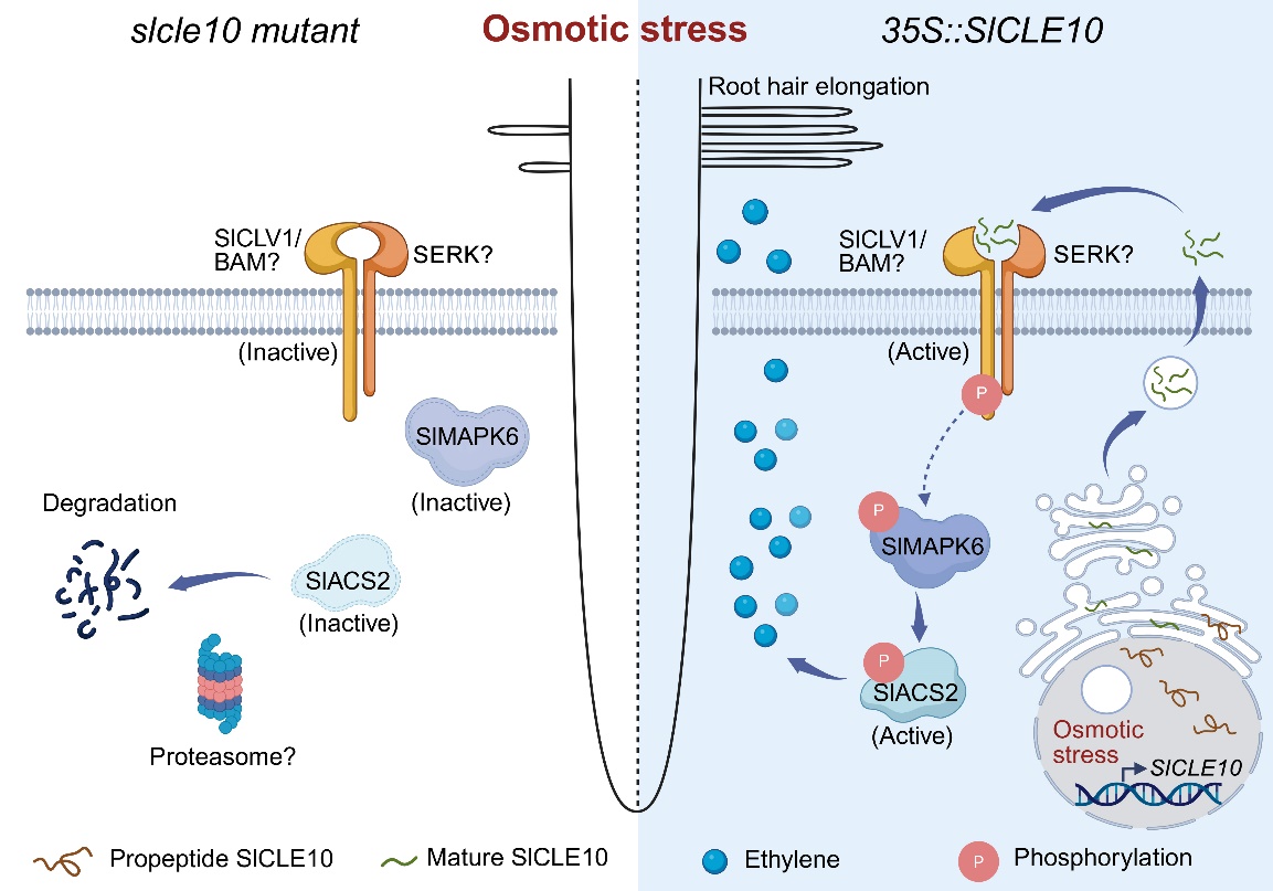 该研究首次揭示了CLE小肽在渗透胁迫下调控根毛发育的分子机制,建立了环境胁迫-CLE肽信号-乙烯合成-根毛发育的调控通路,为理解植物逆境适应性的分子基础提供了新视角。SlCLE10小肽的跨物种功能保守性使其成为作物抗逆改良的理想靶标,为通过基因工程或外源肽施用技术培育广谱抗旱作物提供了重要理论依据和实用策略。